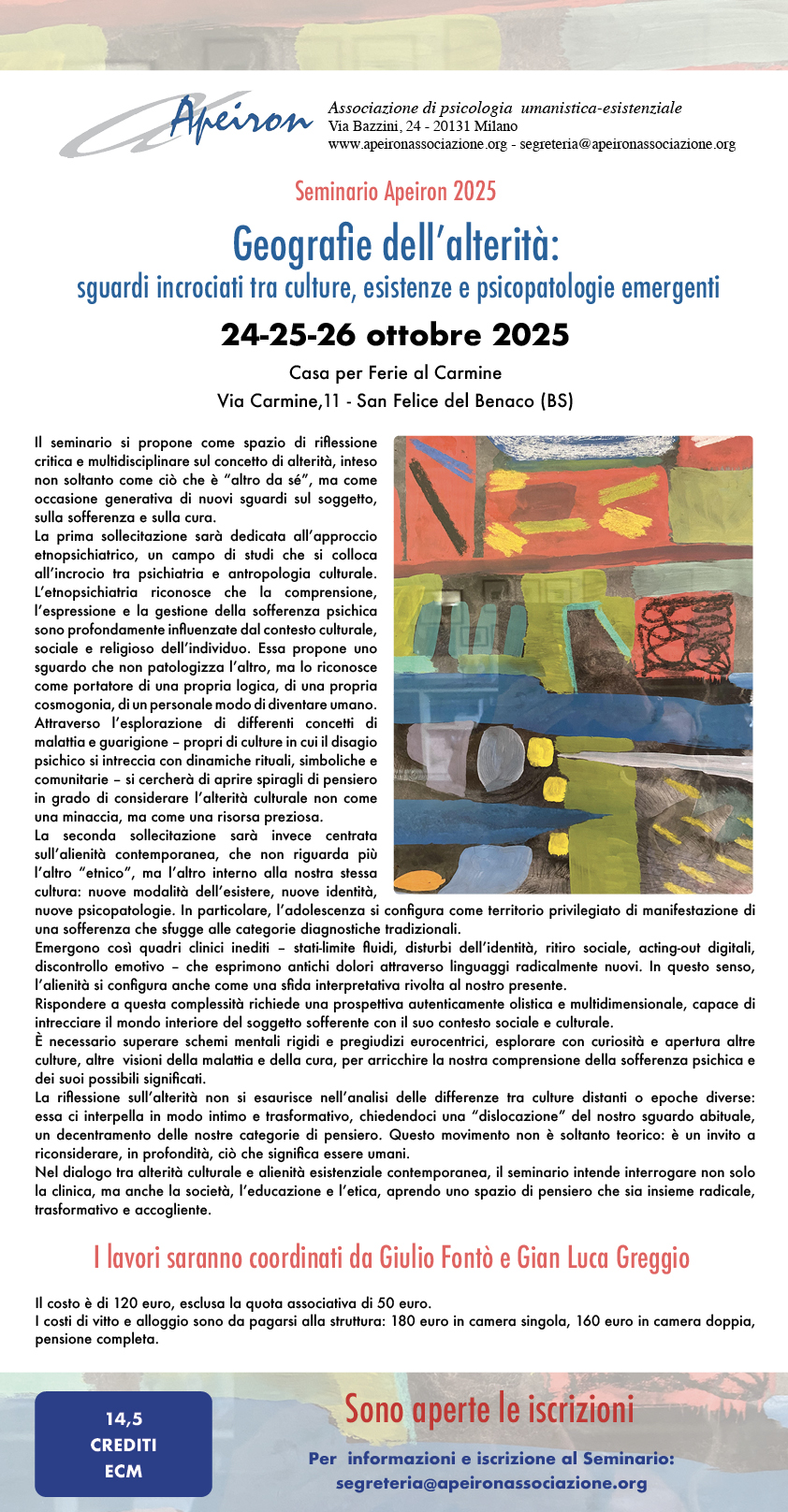 Dal 2009 faccio parte dell’Associazione Apeiron e partecipo ad incontri di intervisione con un gruppo di colleghi dell’Associazione.